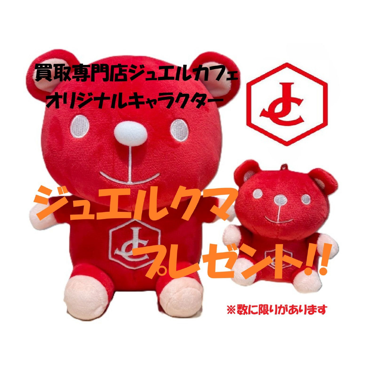 期間中、プラチナ・金・時計・ブランド品を3万円以上買取ご成約頂いたお客様にジュエルカフェオリジナルキャラクターのジュエルクマをプレゼント(数量限定)。