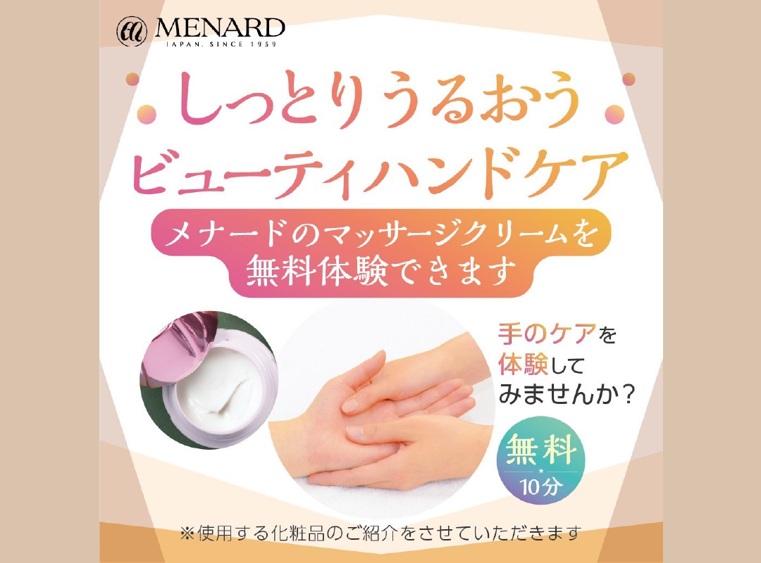 日頃は日置市伊集院町のサロンにて、メナードの肌研究に基づいた独自のエステティックメゾッドで、お肌の悩みに合わせたカウンセリングと顔からデコルテまでの本格的な施術をご提供しております。まずは、セラピストによるハンドマッサージを無料体験してみませんか?