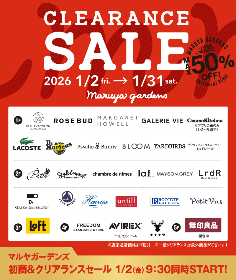 クリアランスセール! HOME イベント&キャンペーン クリアランスセール! 開催日 2026/1/2(金)〜1/31(土) 最大50%OFF! マルヤガーデンズのクリアランスセールが1月2日よりスタート!! マルヤガーデンズでのお買い物をお楽しみくださいませ♩ イベント & キャンペーン一覧
