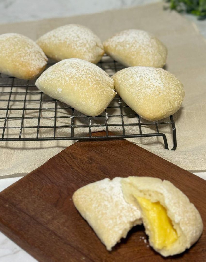 米粉パン生地にやさしい甘さのクリームを包みます。