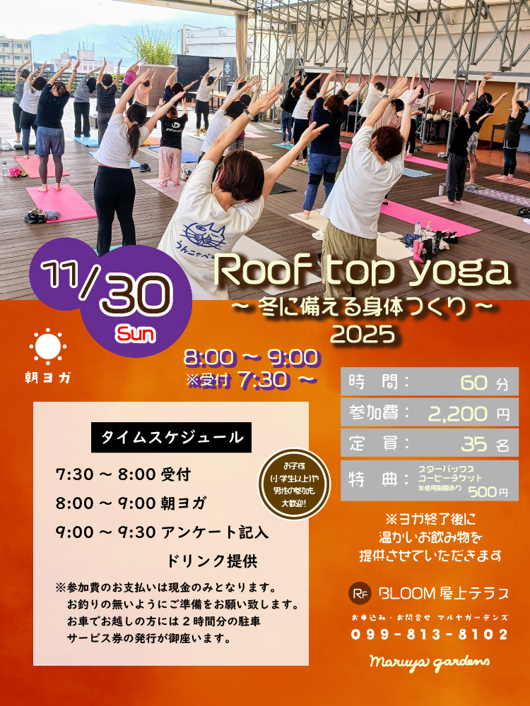 マルヤガーデンズの屋上テラスにて行う朝ヨガイベントです。