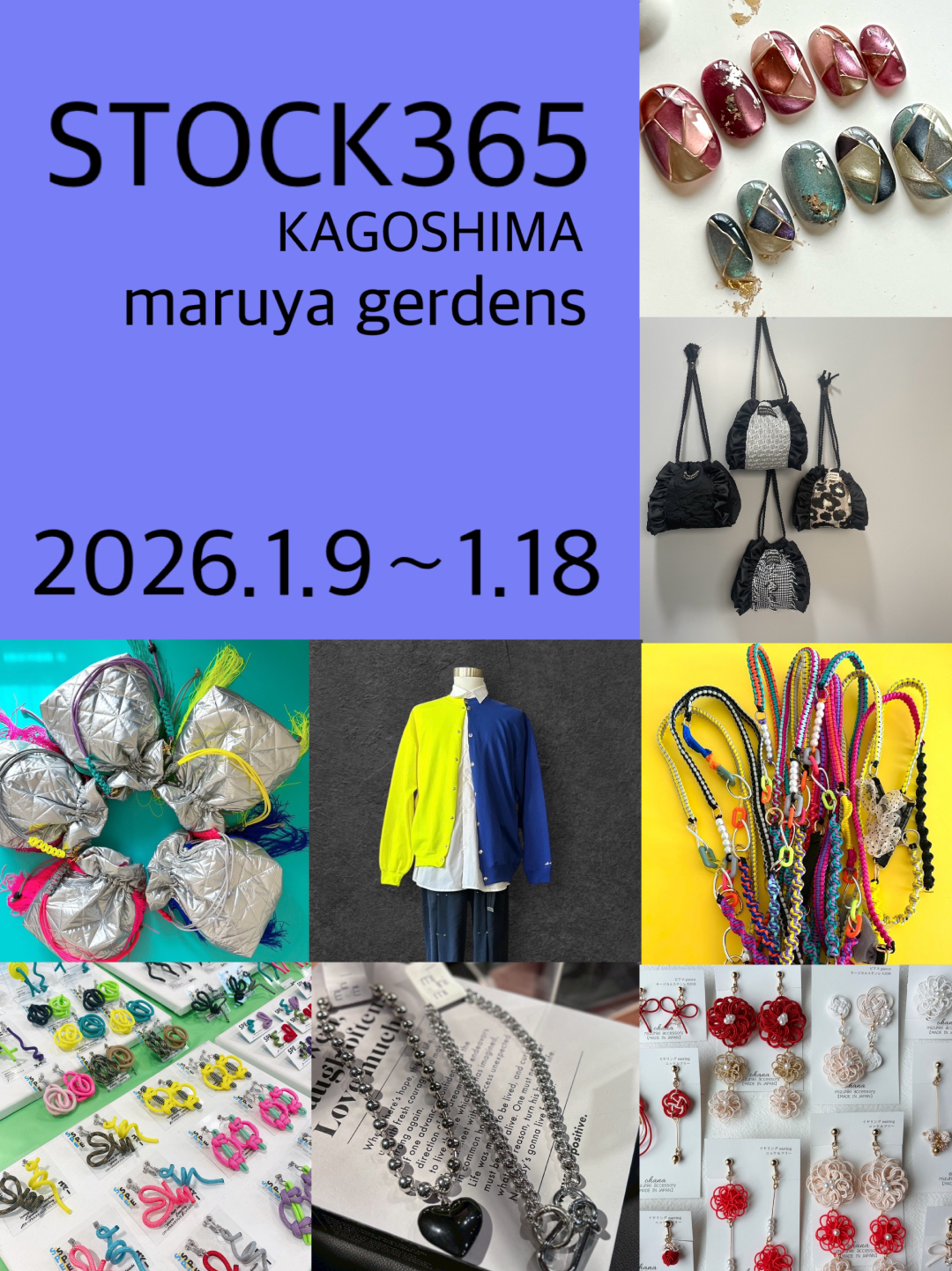 STOCK 365 HOME イベント&キャンペーン STOCK 365 開催日 2026/1/9(金)〜1/18(日) 全国から厳選し集めた個性的なオシャレがストックされていて、あなたに合うオシャレが見つかるハンドメイドのセレクトショップです♩ 【会場】2F 下りエスカレーター前 SNS イベント & キャンペーン一覧